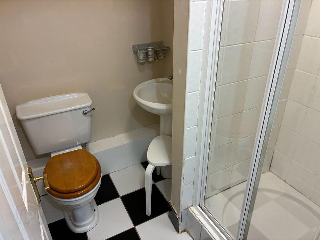 1.77m x 1.18m Tiled floor & shower cubicle, power shower, shaving light