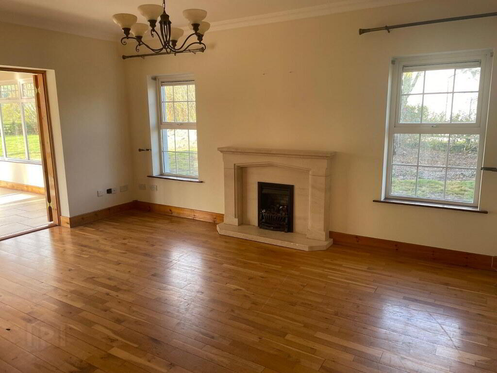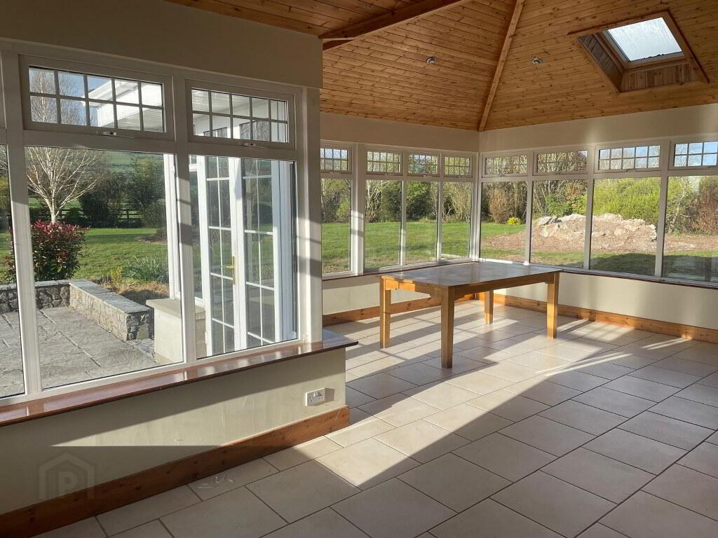 3.95m x 5.16m Stone fire surround with gas fire insert. Sun room off with wrap around windows overlooking garden