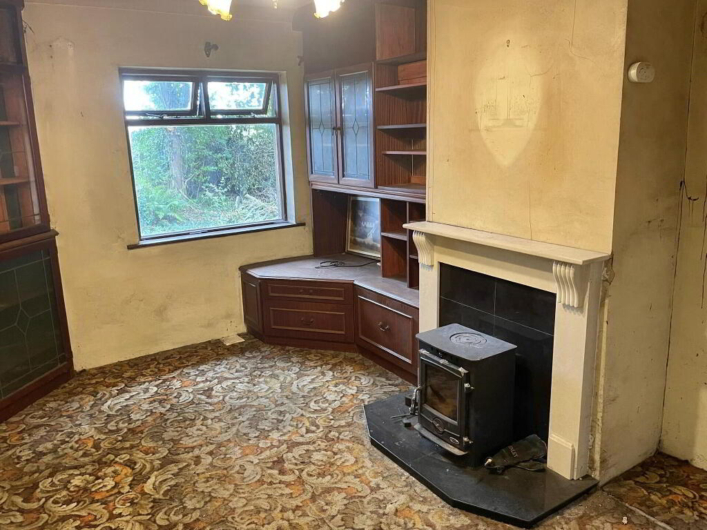 4.30m x 2.81m Carpet, stove fire and wooden cabinets.