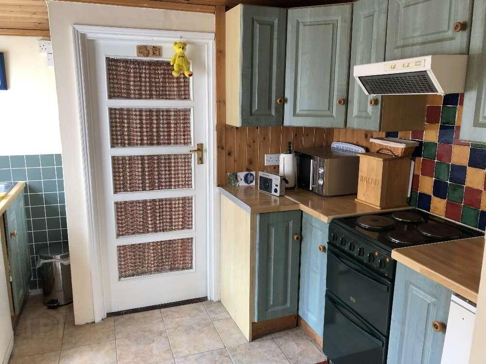 Traditional kitchen with selection of floor & eye level units, plumbed for dishwasher, Tiled floor & splashback, Timber ceiling, door to rear, Shower Room off.
