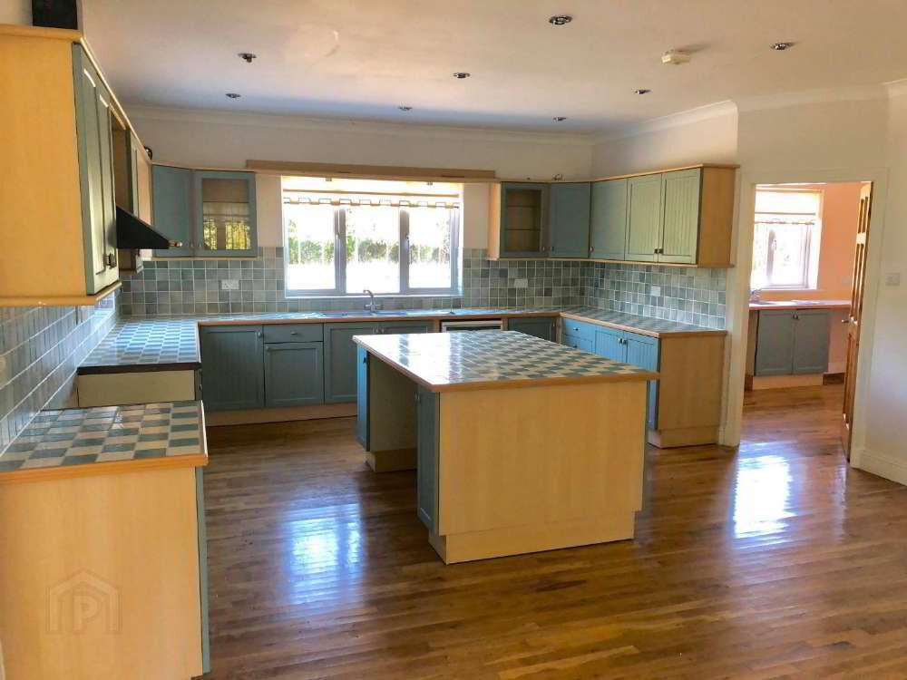 8.25m x 5.00m Solid white oak timber flooring, walls partly painted/tiled in kitchen area, cornicing, double glazed white PVC windows to front, rear and side with blinds, country style fitted kitchen with tiled worktop, centre island with space for fridge and freezer, space and plumbed for dishwasher, telephone point, tv point, centre light and recessed lighting, door to utility room.
