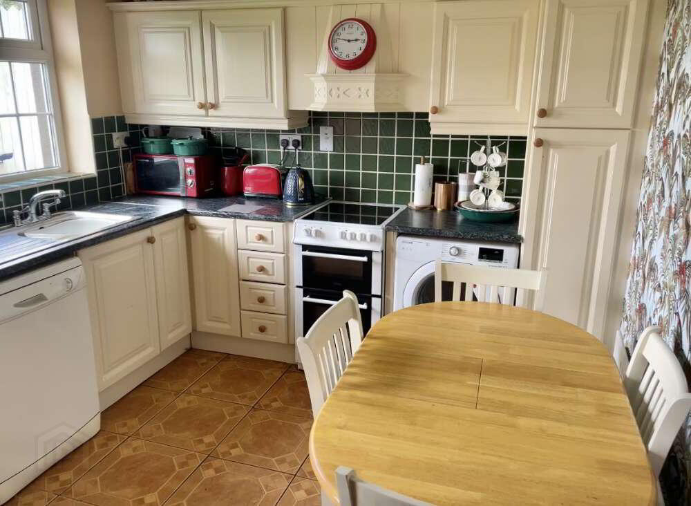 3.60m x 2.90m Tiled floor and splashback, floor and eye level units. Door to rear garden. Cooker, washing machine, dishwasher, dryer and extractor included in the sale