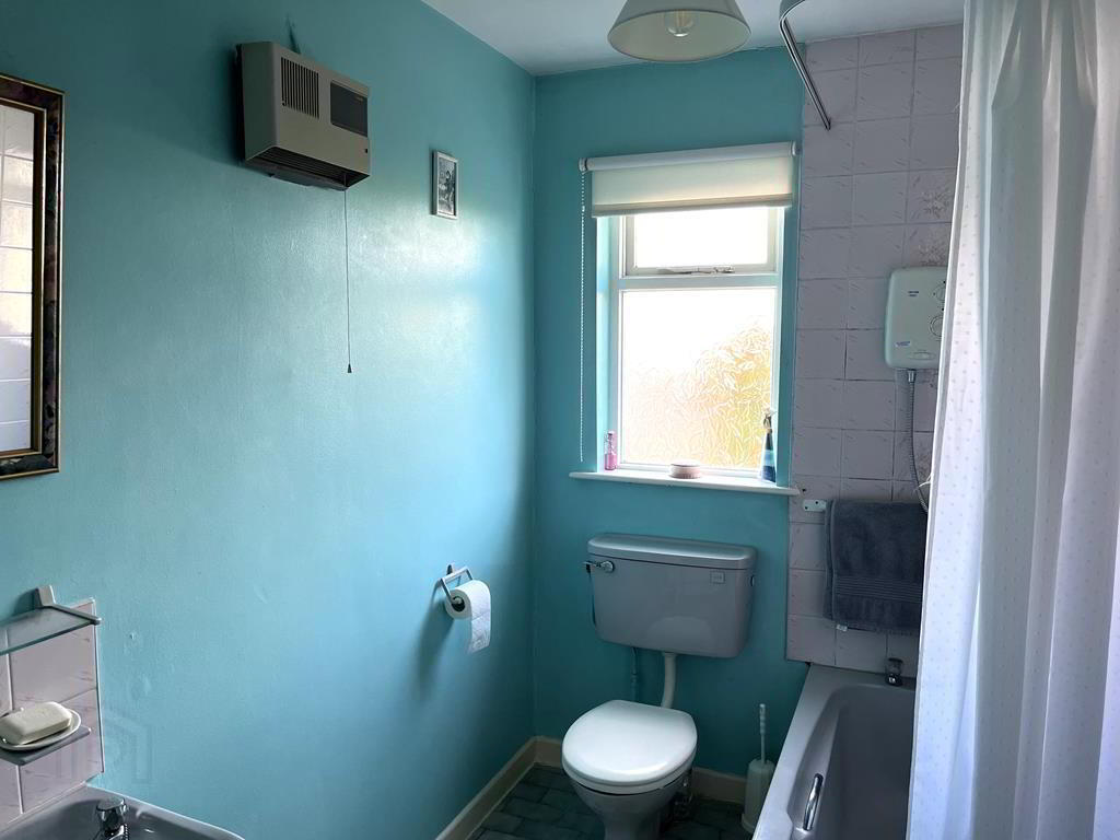 Tiled floor, Triton T80si electric shower over bath, electric fan heater, window provides for natural ventilation.