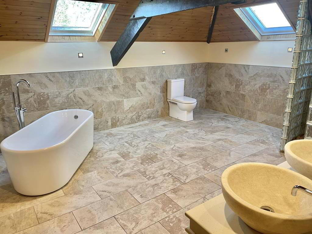 4.65m x 3.85m Generous walk in shower, tiled, glass block shower surround, free standing bath, vanity unit, ceramic top, ceramic his and her wash basins, velux windows, exposed beams, timbe ceiling, door to rear stairway leading to studio