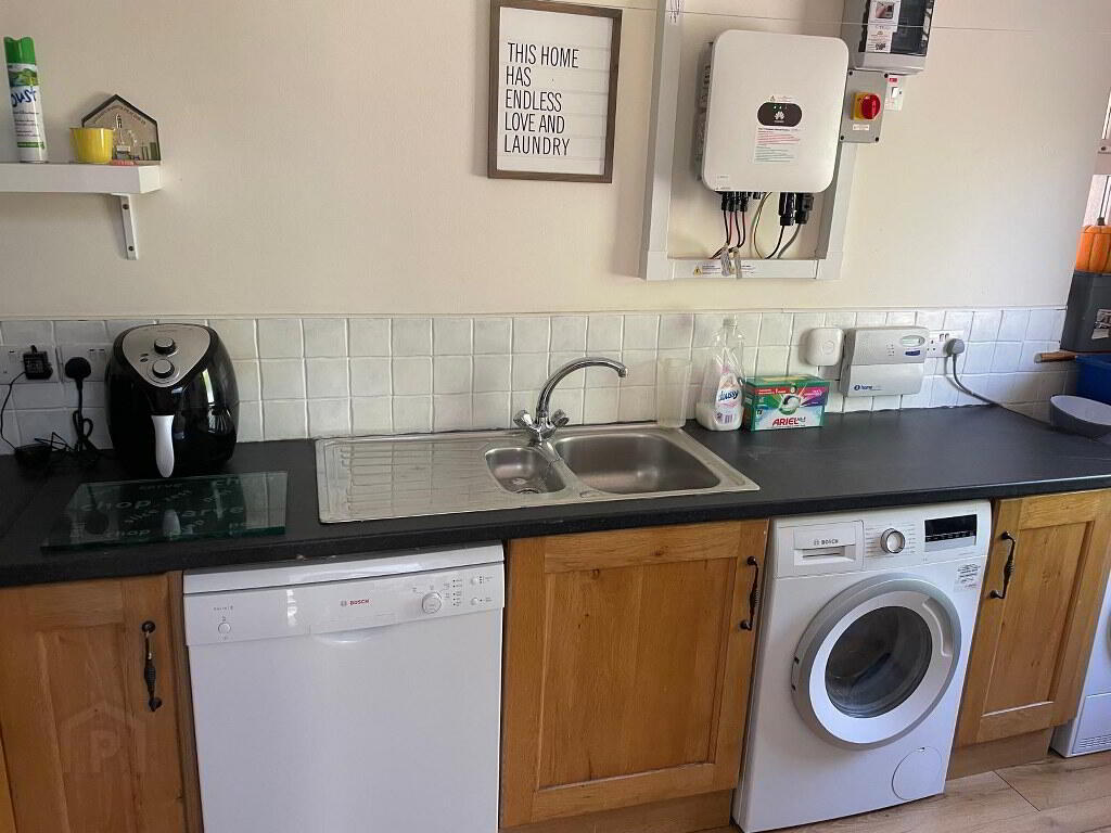 3.80m x 1.70m Fitted units, plumbed for washing machine, dryer, dishwasher, window, shelving, door to rear.