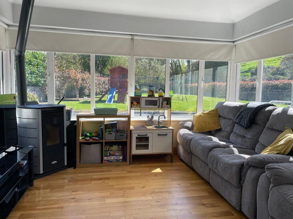 3.90m x 3.75m Wooden flooring, Stanley pellet burner, marble hearth and surround, TV point, views over garden.