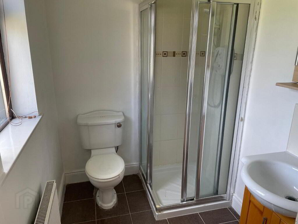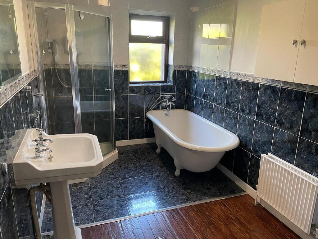 3.55m x 2.15m Full bathroom suite, shower stall, Triton T80z shower, shaving light, extractor, window provides for natural ventilation, roof light.