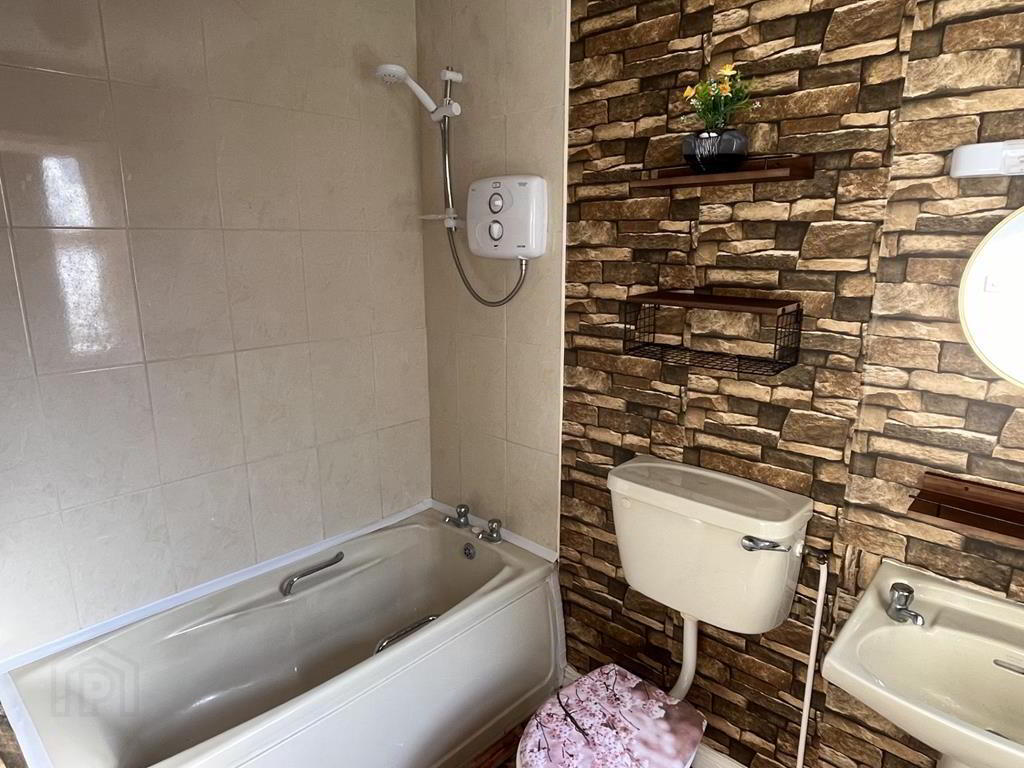 2.80m x 1.60m Nice well maintained room with sink, toilet, bath and electric shower over bath. Lino floor covering and tiled wall around bath and shower.